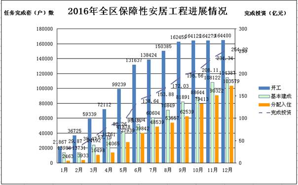 (一)2016年保障性安居工程建設進展情況。2016年,國家下達我區目標任務為棚戶區改造新開工16萬套(戶),新增發放住房租賃補貼0.47萬戶,基本建成7.1萬套,分配入住7.58萬套。截至12月25日,全區棚戶區改造項目新開工16.44萬套、1259.78萬平方米,完成年度目標任務的102.75%;全區新增發放住房租賃補貼10923戶,完成年度目標任務的234.65%;基本建成11.44萬套、799.81萬平方米,完成年度目標任務的161.11%;新增分配入住10.36萬套,完成年度目標任務的136.65%;全區保障性安居工程完成投資254.22億元,占全年計劃投資242億元的105.05%。