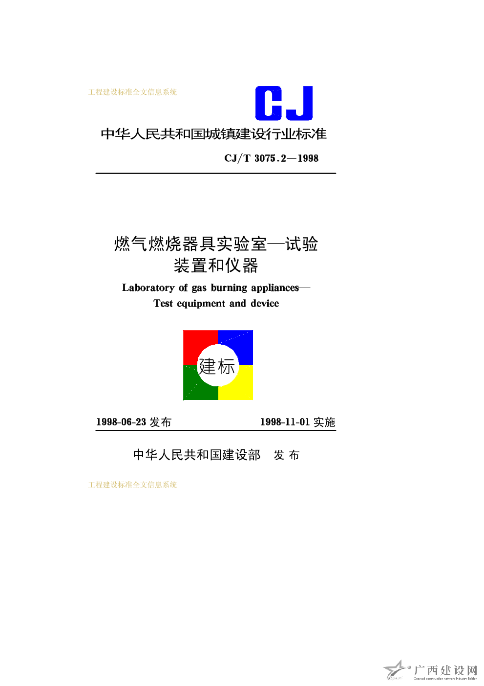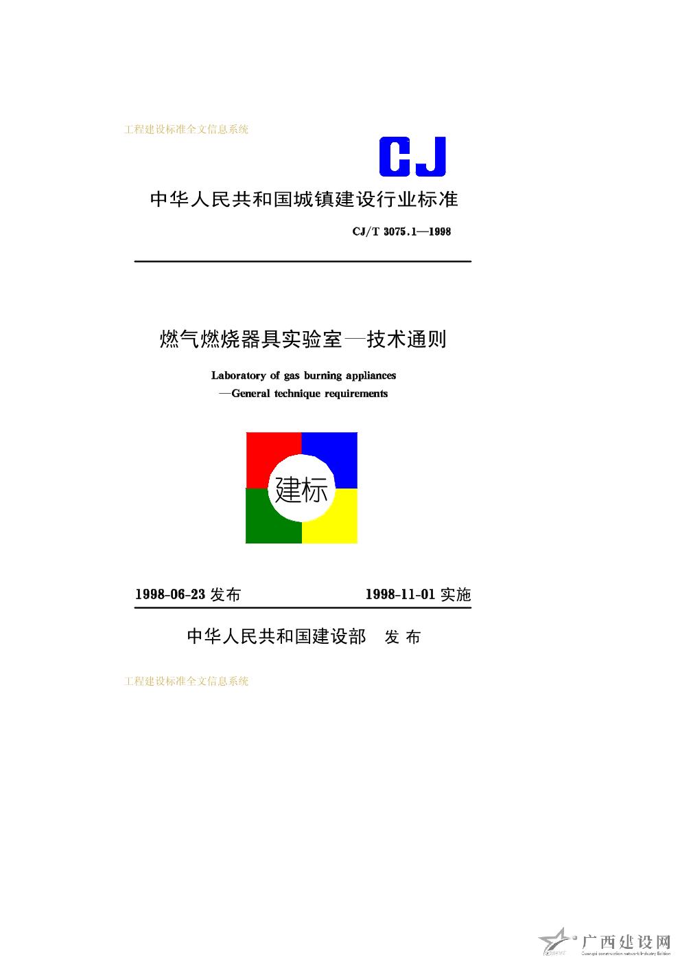 燃氣燃燒器具實驗室—技術通則 CJ/T3075.1—1998