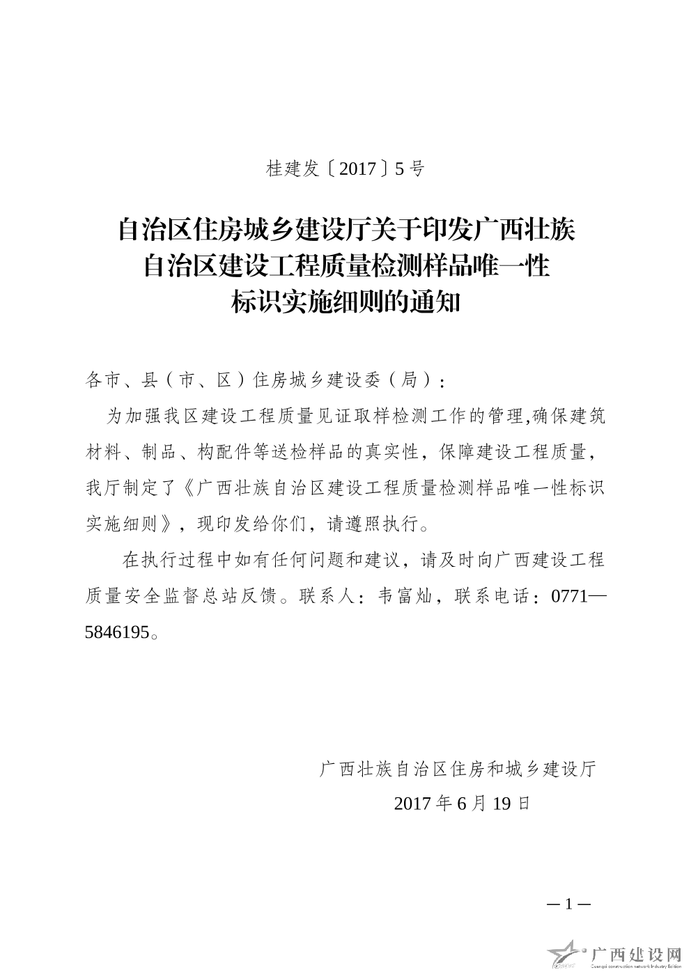 桂建發(fā)〔2017〕5號自治區(qū)住房城鄉(xiāng)建設(shè)廳關(guān)于印發(fā)廣西壯族自治區(qū)建設(shè)工程質(zhì)量檢測樣品唯一性標識實施細則的通知
