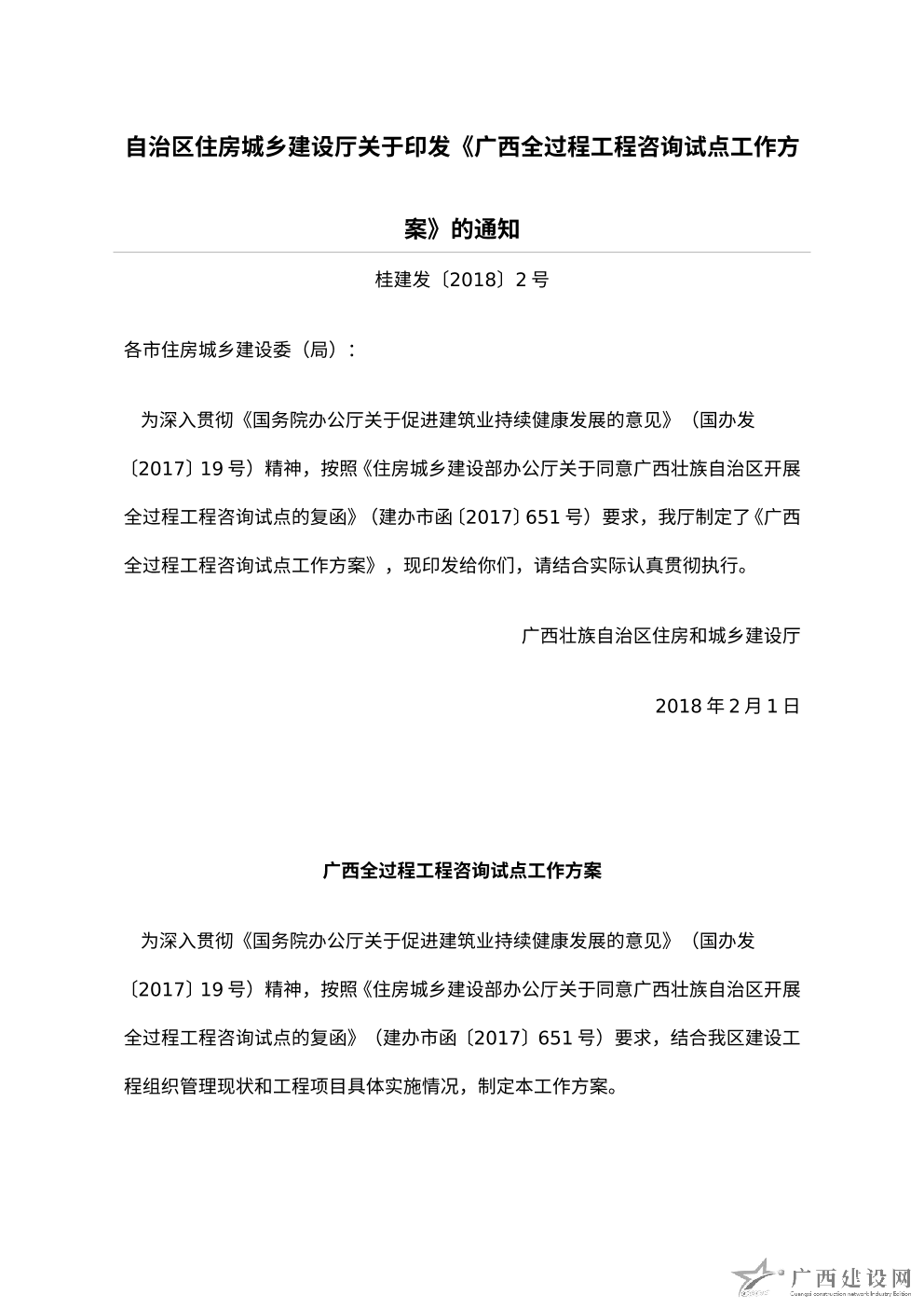 桂建發(fā)〔2018〕2號自治區(qū)住房城鄉(xiāng)建設(shè)廳關(guān)于印發(fā)《廣西全過程工程咨詢試點工作方案》的通知