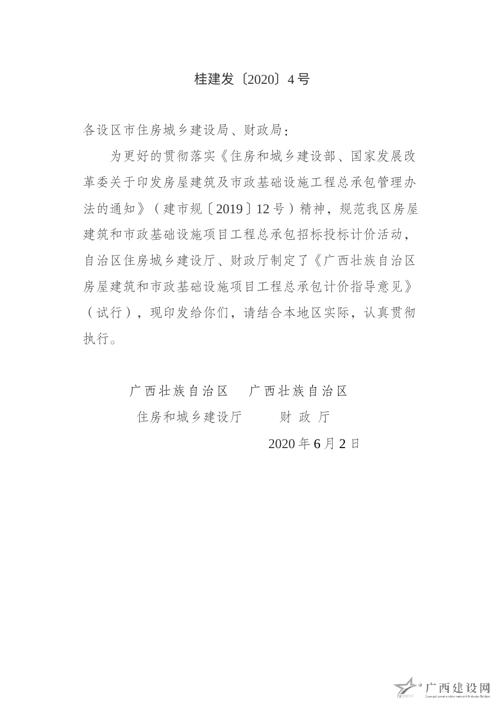 桂建發(fā)〔2020〕4號自治區(qū)住房城鄉(xiāng)建設(shè)廳 財政廳關(guān)于印發(fā)《廣西壯族自治區(qū)房屋建筑和市政基礎(chǔ)設(shè)施項目工程總承包計價指導(dǎo)意見》(試行)的通知