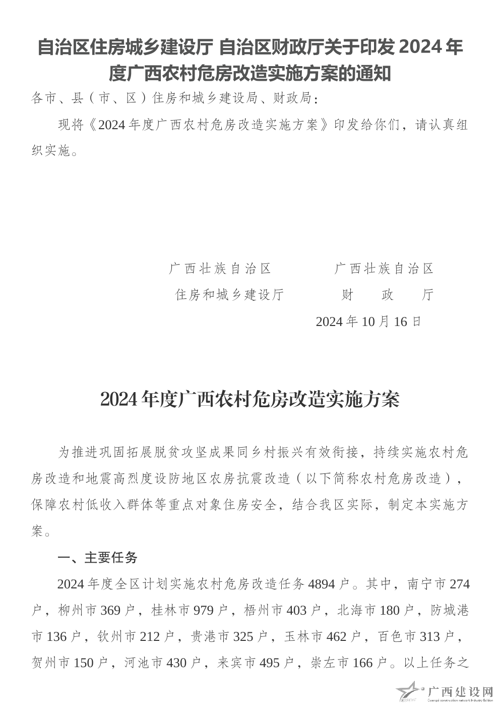 自治區(qū)住房城鄉(xiāng)建設(shè)廳 自治區(qū)財政廳關(guān)于印發(fā)2024年度廣西農(nóng)村危房改造實施方案的通知