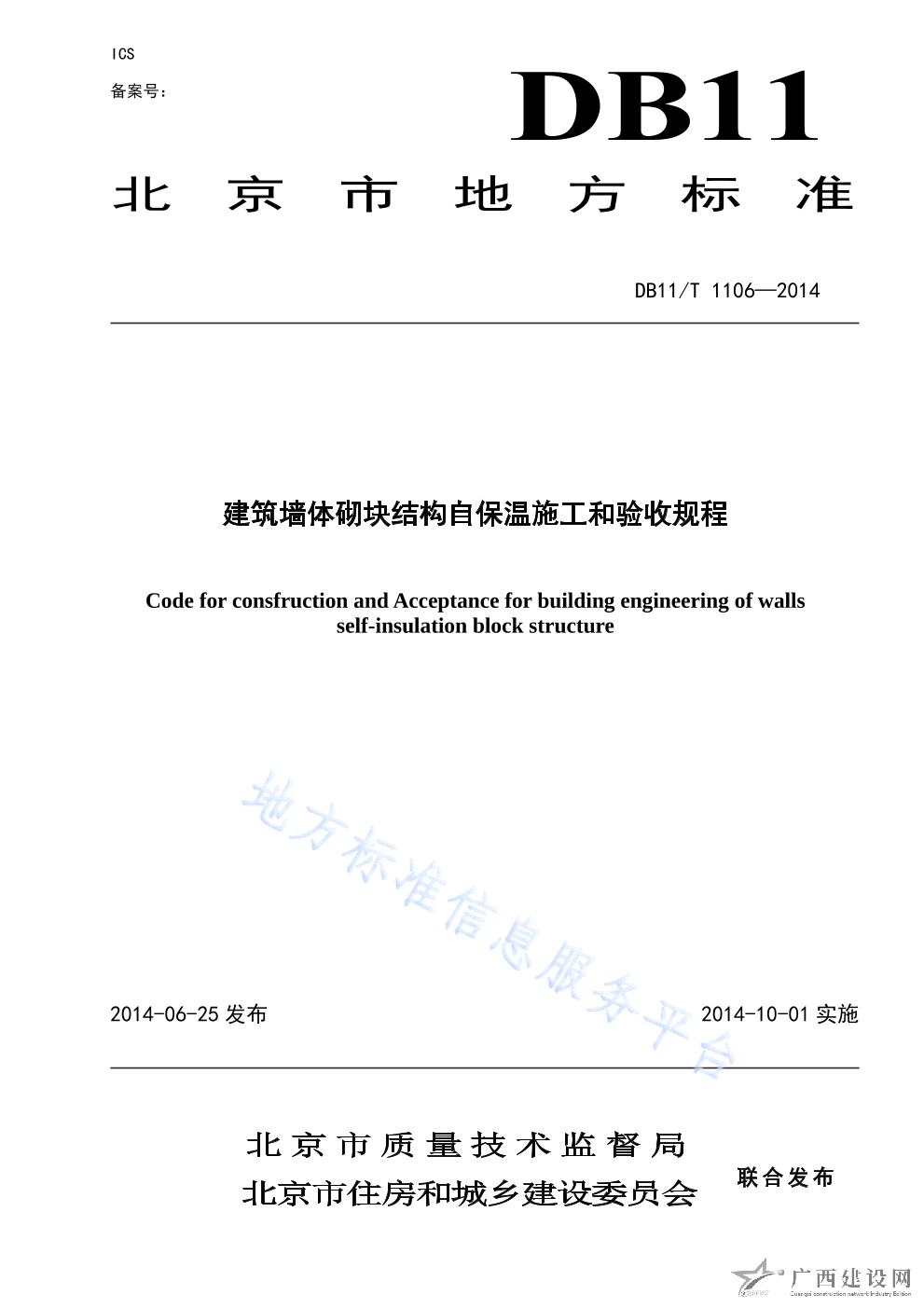 DB11 T_1106-2014建筑墻體砌塊結構自保溫施工和驗收規程