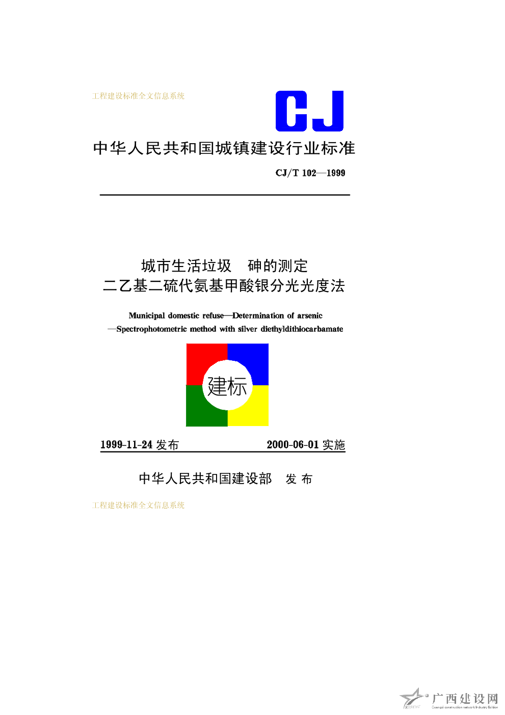 城市生活垃圾砷的測定二乙基二硫代氨基甲酸銀分光光度法 CJ/T102—1999