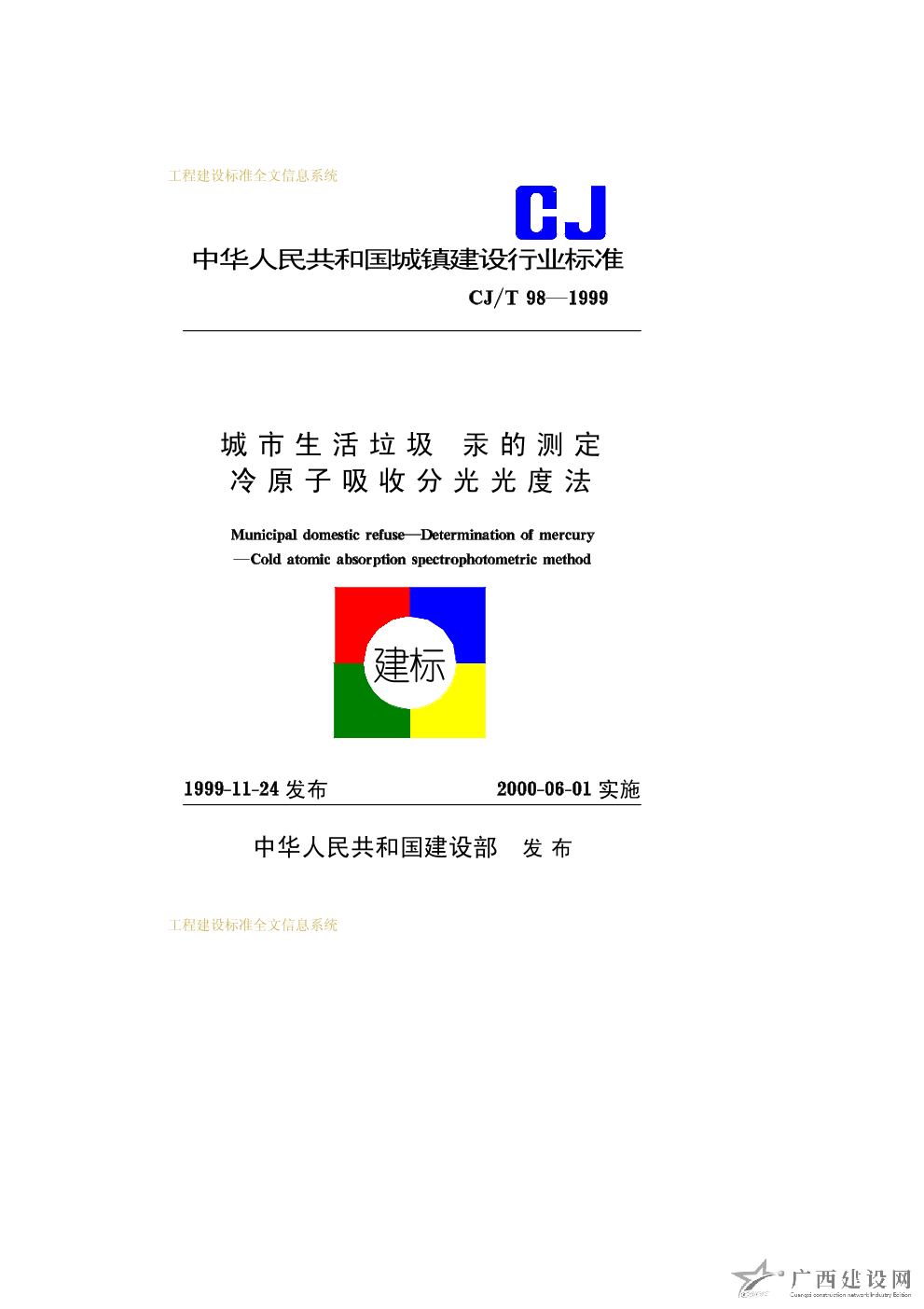 城市生活垃圾汞的測定冷原子吸收分光光度法 CJ/T98—1999