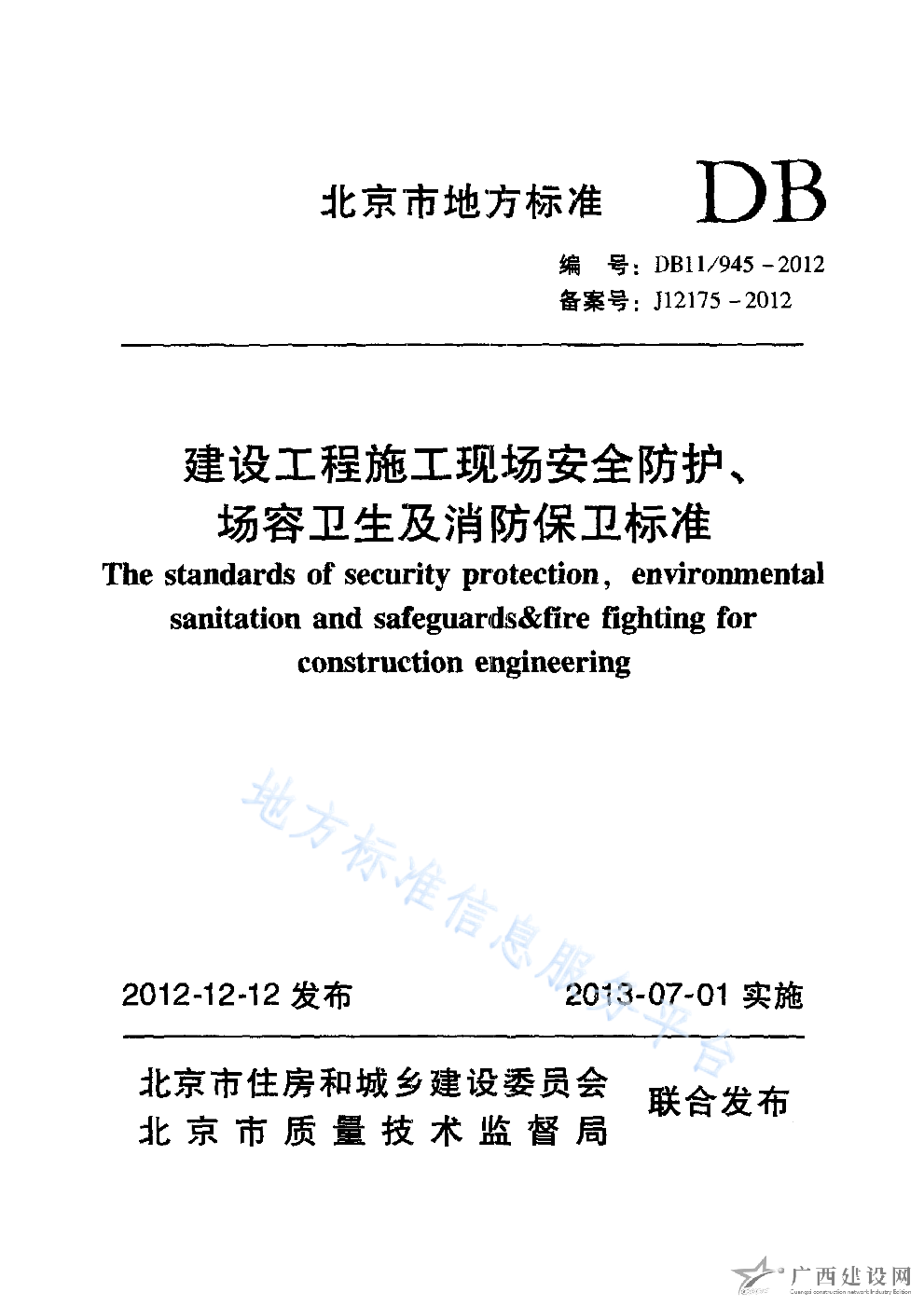 DB11 945-2012_建設(shè)工程施工現(xiàn)場(chǎng)安全防護(hù)、場(chǎng)容衛(wèi)生及消防保衛(wèi)標(biāo)準(zhǔn)