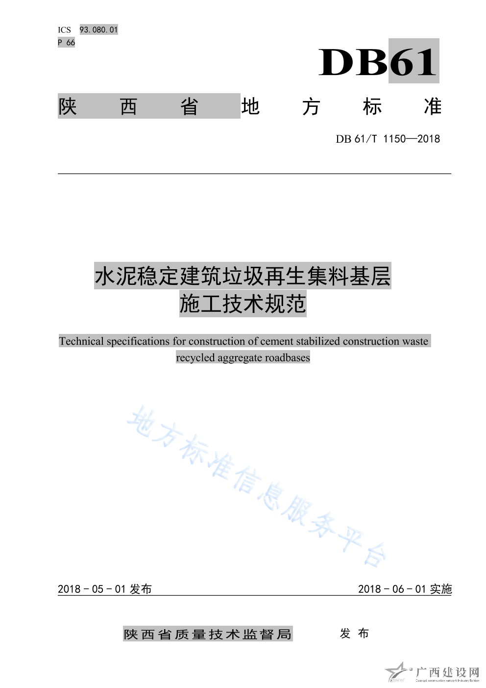 DB61 T1150-2018水泥穩(wěn)定建筑垃圾再生集料基層施工技術(shù)規(guī)范