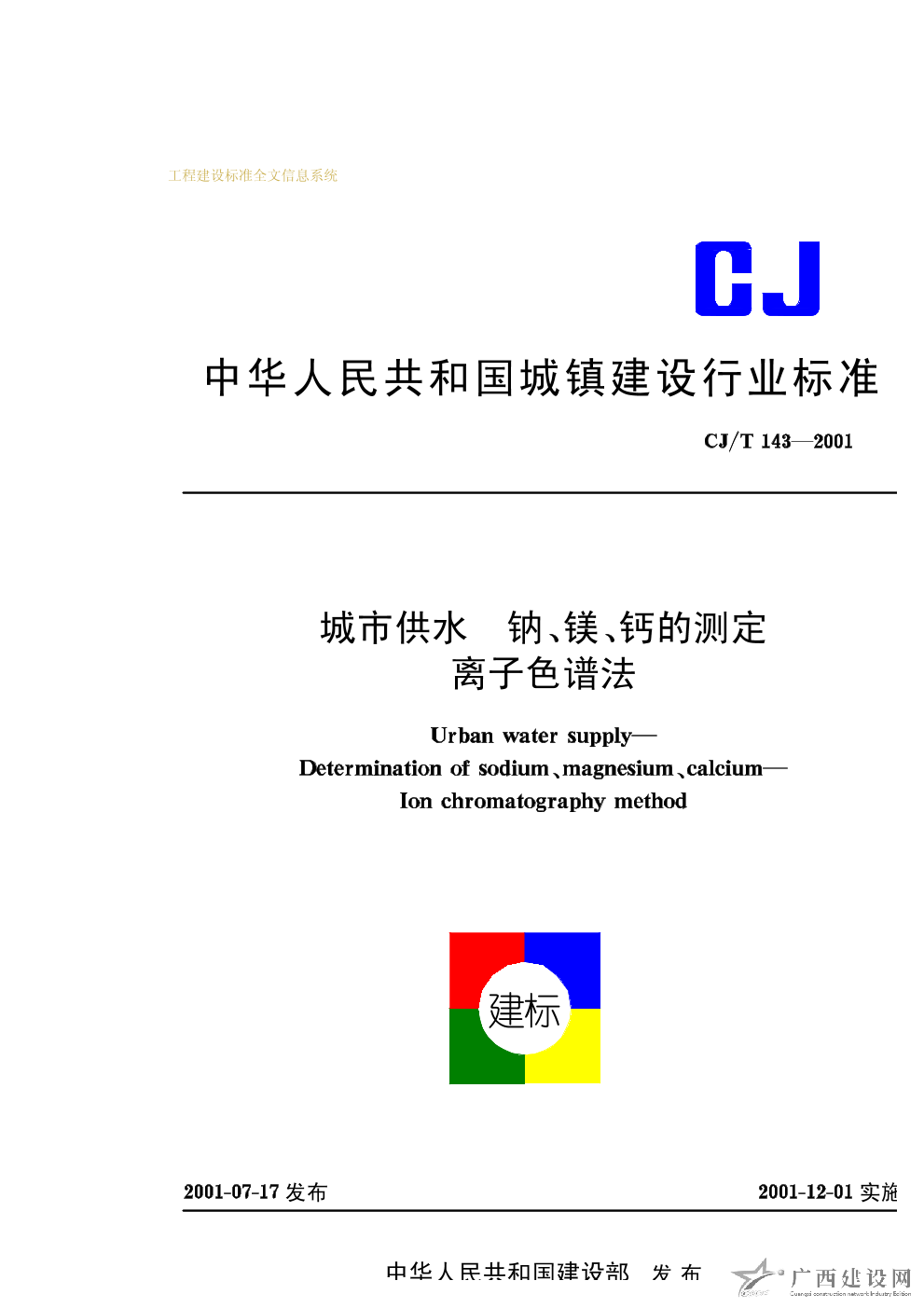 城市供水 鈉、鎂、鈣的測定離子色譜法 CJ/T143—2001