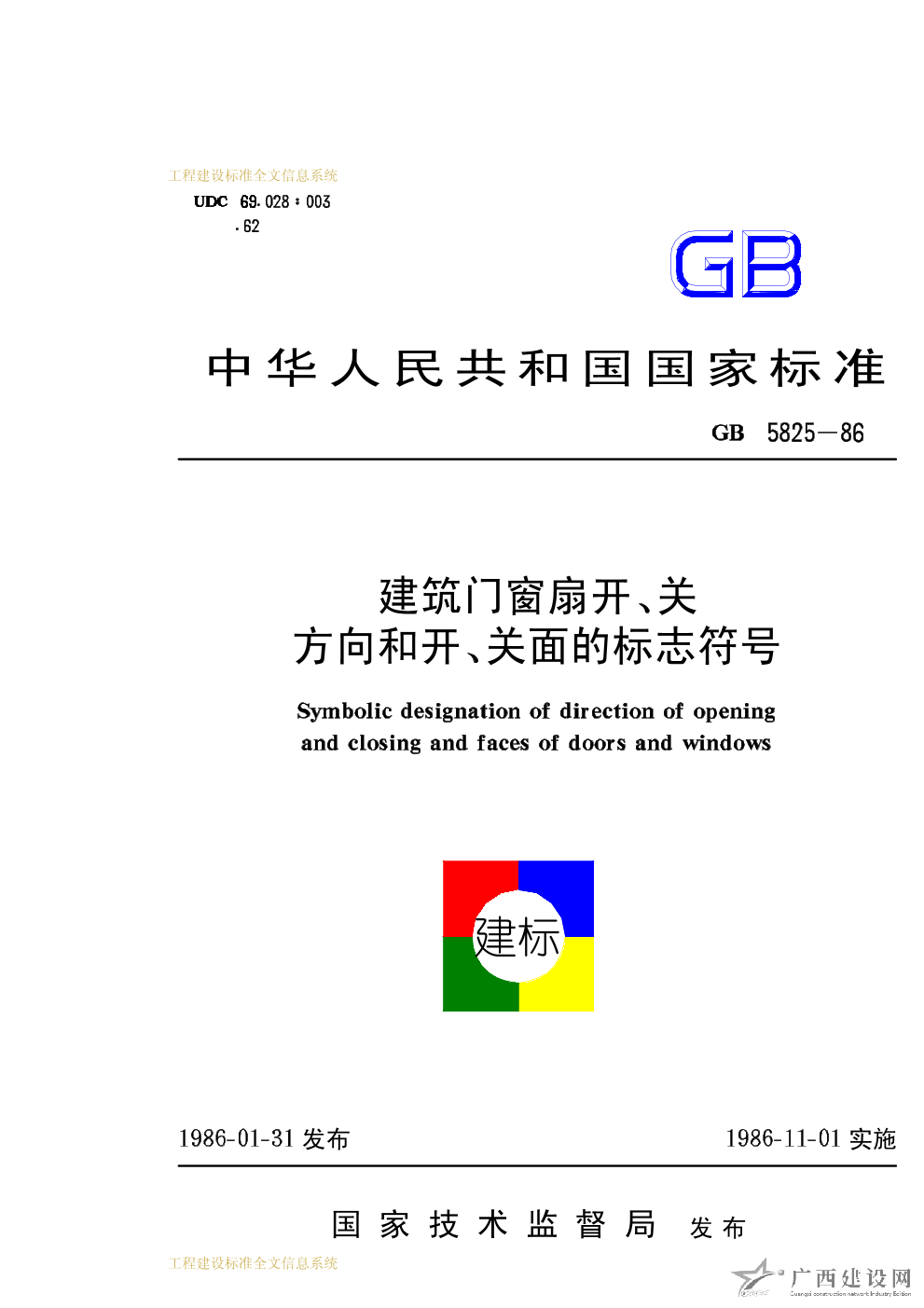 建筑門窗扇開、關方向和開、關面的標志符號 GB5825-86