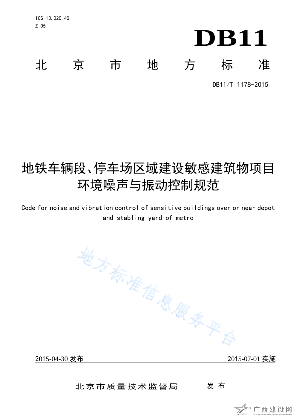 DB11 T_1178-2015地鐵車輛段、停車場區域建設敏感建筑物項目環境噪聲與振動控制規范