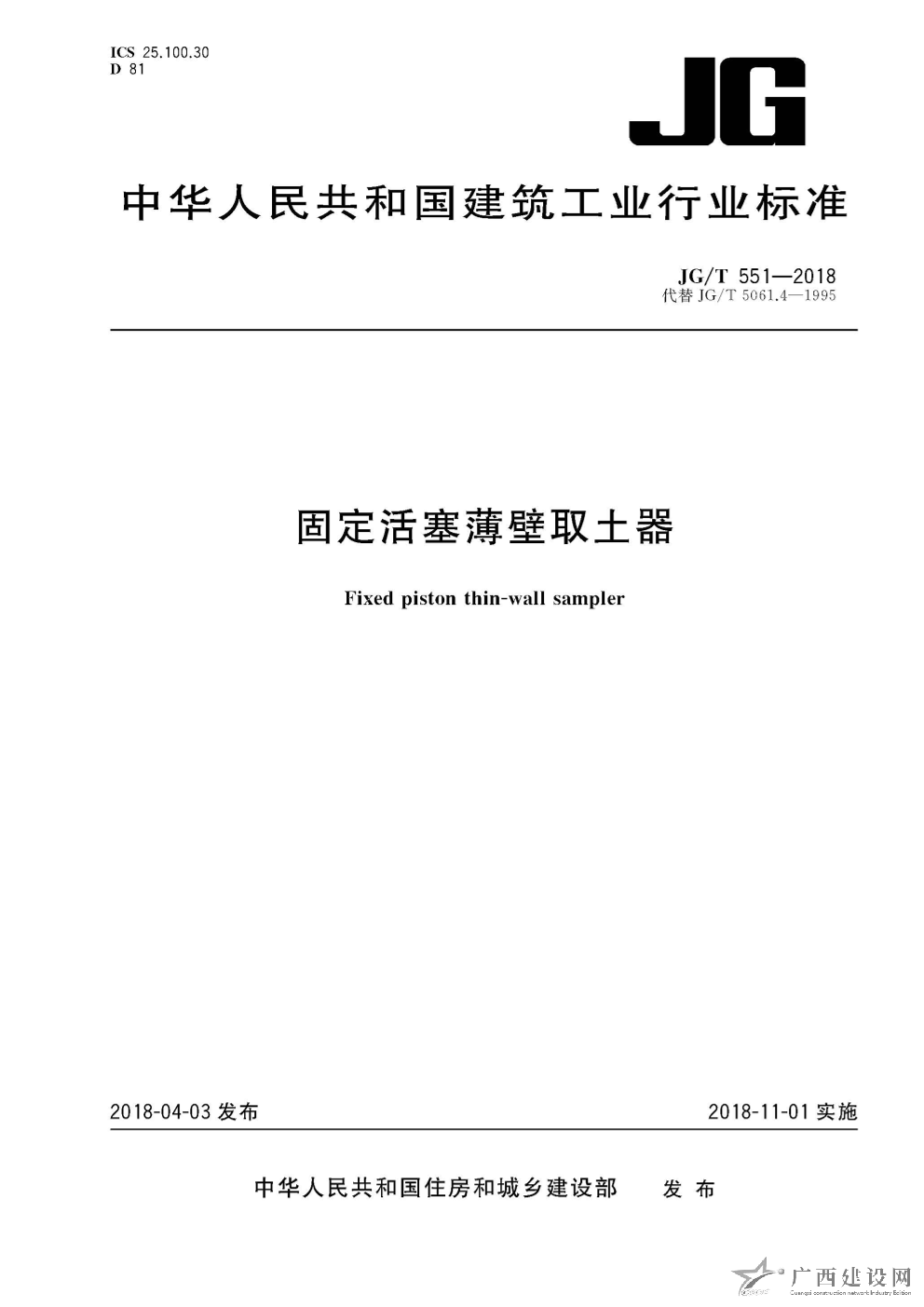 JG-T551-2018:固定活塞薄壁取土器