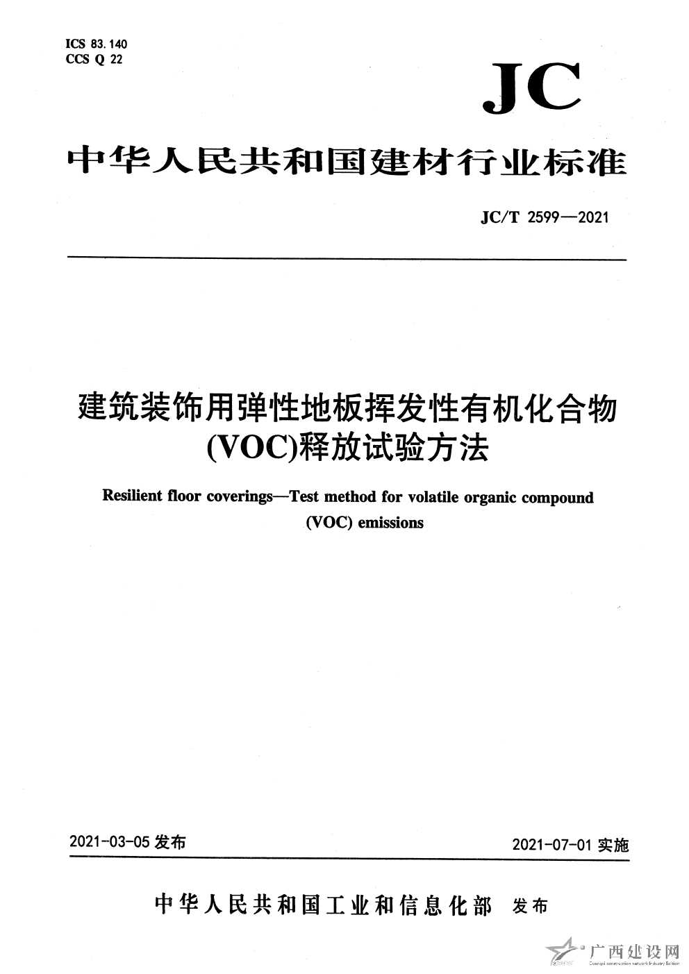 JC T 2599-2021 建筑裝飾用彈性地板揮發(fā)性有機化合物(voc)釋放試驗方法