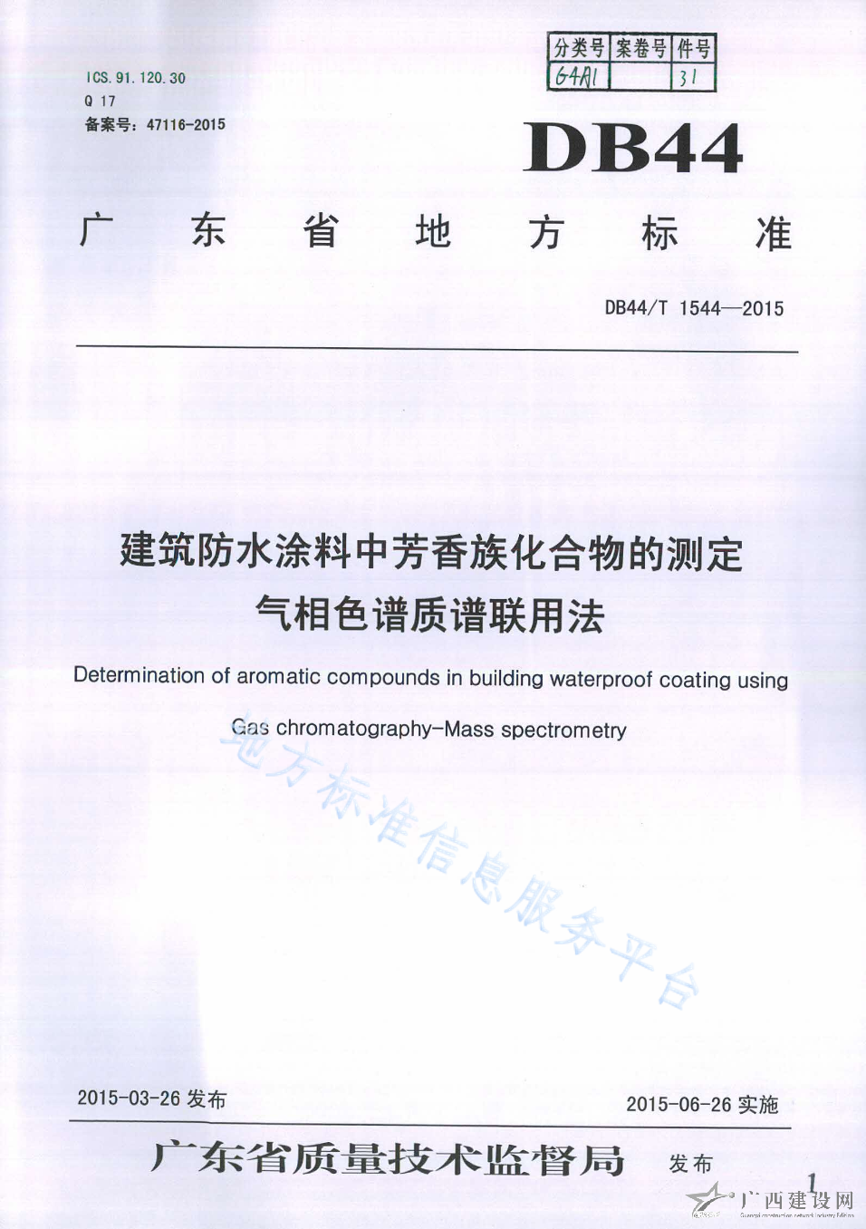 DB44 T 1544-2015建筑防水涂料中芳香族化合物的測定 氣相色譜質譜聯(lián)用法